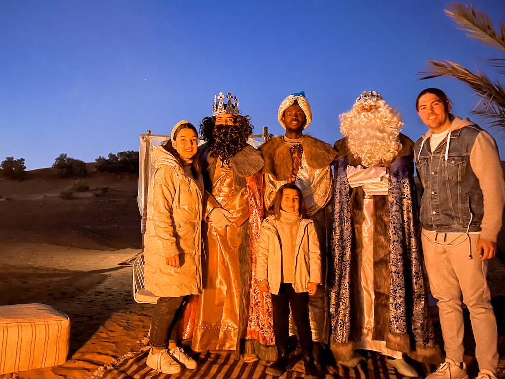 Camino al desierto conocimos y nos empapamos de la cultura marroquí, disfrutamos de un atardecer increíble en el desierto y al día siguiente, bajo las estrellas y con los tambores de fondo sonando, vimos a lo lejos a los Reyes Magos, que se acercaros y muy amablemente estuvieron un ratito con nosotros. Después de esta mágica noche, solo nos quedó regresar a la vibrante Marrakech para alucinar con su gente y el ajetreo de sus calles.